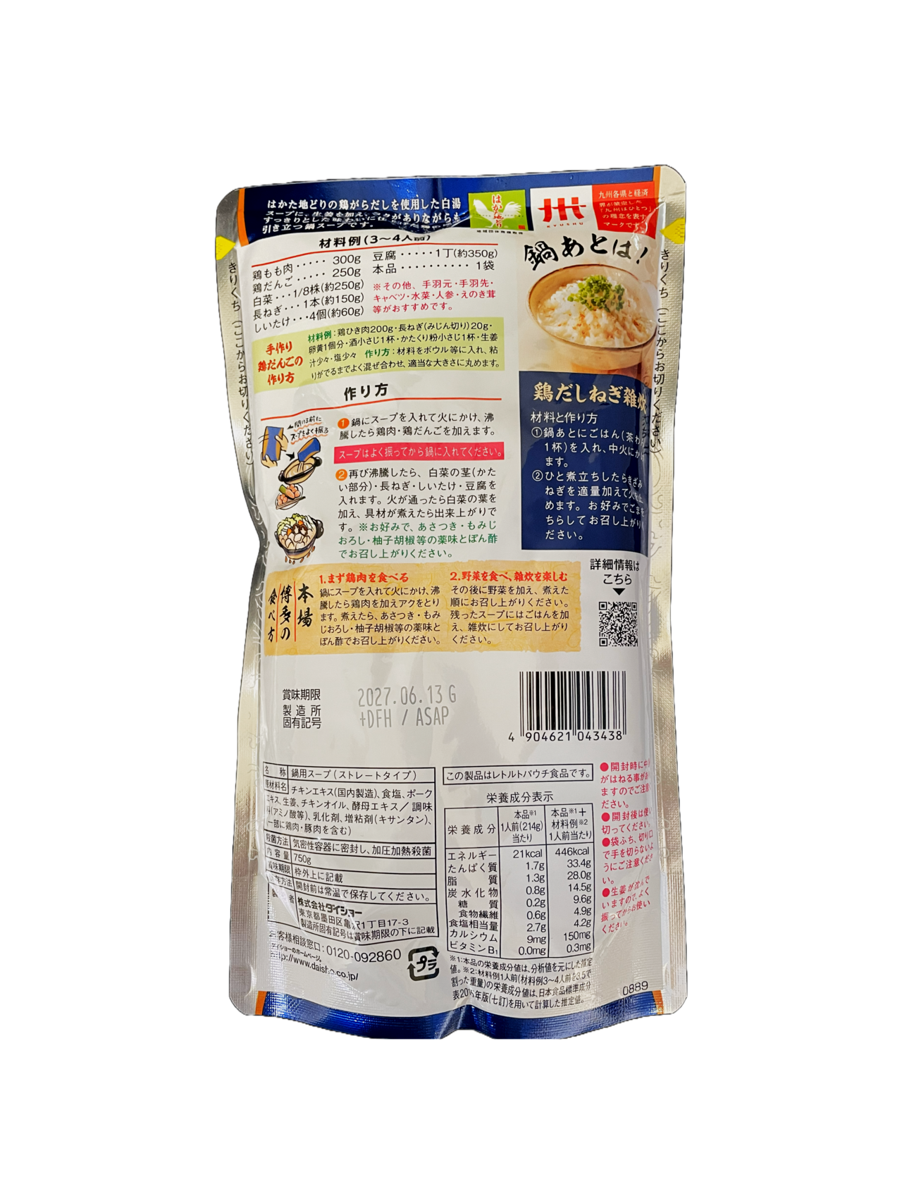 「はかた地どり」の鶏ガラをベースにした白湯(パイタン)仕立ての『鍋スープ』です。水で薄めなくていい、鍋に入れて温めるだけのストレートタイプとなっており、鶏の旨味が凝縮したスープの中に、生姜の後味さっぱりとした食べやすい味わいになっています。